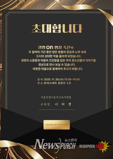 뉴스펀치 김완규 기자 | 서울특별시교육청 산하 서울특별시동부교육지원청은 오는 11월 26일 13시 30분, 청량리 롯데시네마에서 청소년 생명존중・자살예방 영상 축제인 '생명ON 영상축전'을 개최한다.