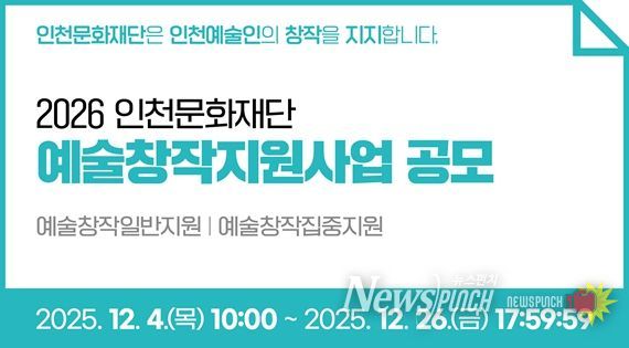 뉴스펀치 김길룡 기자 | 인천문화재단은 오는 12월 2026 예술창작지원사업 공모를 시작한다. 공모 분야는 예술창작일반지원, 예술창작집중지원으로 두 가지이다. 접수기간은 2025년 12월 4일부터 12월 26일까지이며, 국가문화예술지원시스템으로 온라인 신청을 받는다.