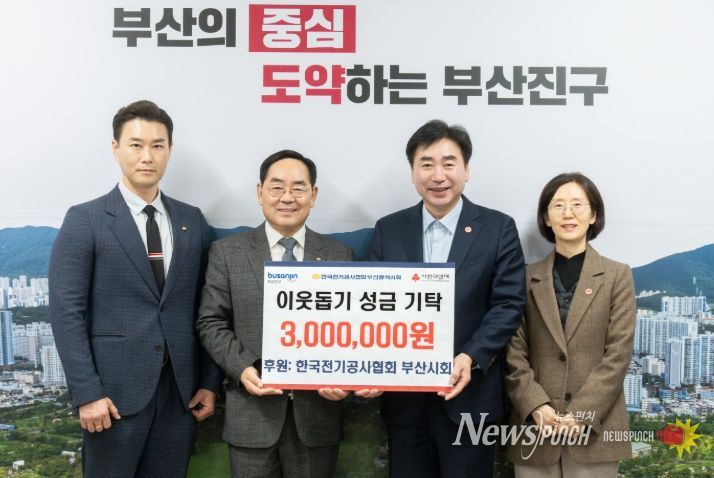 뉴스펀치 김길룡 기자 | 부산 부산진구는 11월 24일, 한국전기공사협회 부산광역시회(회장 추한권)에서 부산진구청을 방문하여 이웃돕기 성금 300만 원을 기탁했다고 전했다.