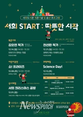 뉴스펀치 김길룡 기자 | 이천시 서희도서관은 개관을 기념하고 한 해를 마무리하는 송년 행사로, 시민들과 함께하는 문화예술과학 프로그램인 ‘서희 START : 따뜻한 시작’을 12월 한 달간 운영한다고 밝혔다.