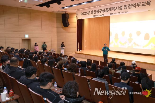뉴스펀치 김길룡 기자 | 울산 동구는 11월 25일 오전 9시 30분 동구청 5층 중강당에서 공공 체육시설 직원과 기간제근로자, 체육회 지도자 등 70여 명을 대상으로 2025년 법정의무교육 및 직원 친절 교육을 했다.