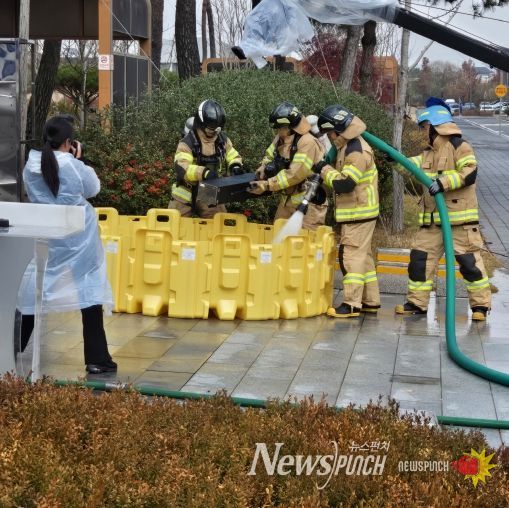 뉴스펀치 김윤걸 기자 | 나주소방서는 11월 25일 나주 혁신도시에 위치한 한국전력공사(KEPCO) 본사 데이터센터에서 리튬이온배터리 화재 발생을 가정한 합동소방훈련을 실시했다고 밝혔다.