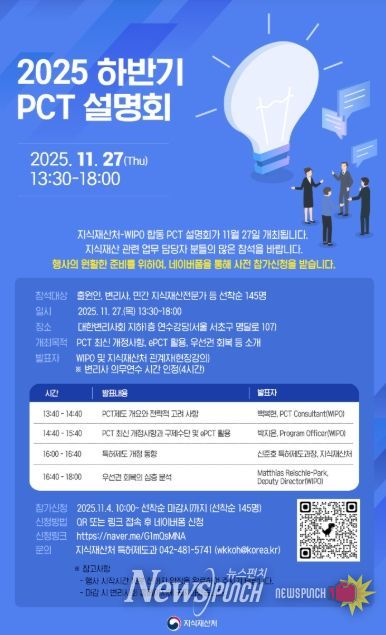 뉴스펀치 조평훈 기자 | 지식재산처는 세계지식재산기구(WIPO)와 공동으로 11월 27일 13시 30분 대한변리사회(서울시 서초구) 연수강당에서 2025년 하반기 특허협력조약* 국제출원 설명회를 개최한다. 이번 설명회는 특허협력조약 제도의 최신 개정 동향과 전략적 활용방안을 공유하기 위해 마련됐으며, WIPO 담당자들이 직접 참석해 대면 설명회를 진행한다.