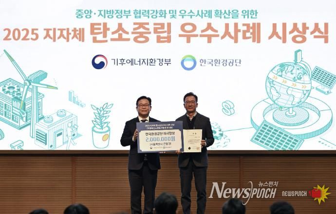 뉴스펀치 김완규 기자 | 서울 은평구는 지난 17일 ‘2025 지자체 탄소중립 콘퍼런스’에서 탄소중립 이행성과 부문 우수기관으로 선정되어 한국환경공단 이사장상을 받았다고 밝혔다.