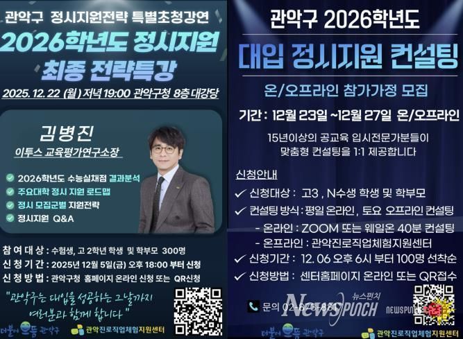 먼저 구는 오는 12월 22일 저녁 7시 관악구청 8층 대강당에서 ’2026 정시전략특강‘을 개최한다. 이번 특강에는 대학 입시 전문가인 ’김병진 이투스 소장‘이 출강해 ▲정시 지원 최신 동향 ▲전형 분석 ▲지원 전략 ▲학과 선택 노하우 등을 심층 분석하고 현실적인 지원 방향을 제시할 계획이다.