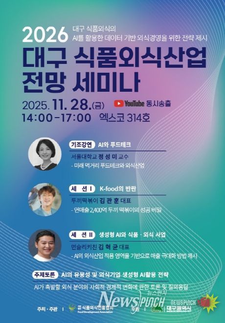 뉴스펀치 조평훈 기자 | 대구광역시와 (사)식품외식진흥협회는 11월 28일 오후 2시, 엑스코 서관 314호에서 ‘2025년 제3회 2026 식품·외식산업 전망 세미나’를 개최한다.