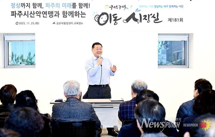 뉴스펀치 김길룡 기자 | 파주시는 지난 25일 금촌어울림센터에서 김종훈 파주시체육회장, 함선호 산악연맹 회장 및 소속 회원단체 등 40여 명이 참석한 가운데 ‘제181회 이동시장실’을 열고, 산악연맹 활성화와 안전한 등산 환경 조성을 위한 현장 의견을 청취했다고 밝혔다.
