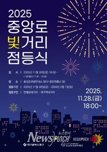 뉴스펀치 조평훈 기자 | 대구 중구는 오는 28일 오후 6시, 동성로관광안내소 앞에서 ‘2025 중앙로 빛거리 점등식’을 개최한다고 밝혔다.