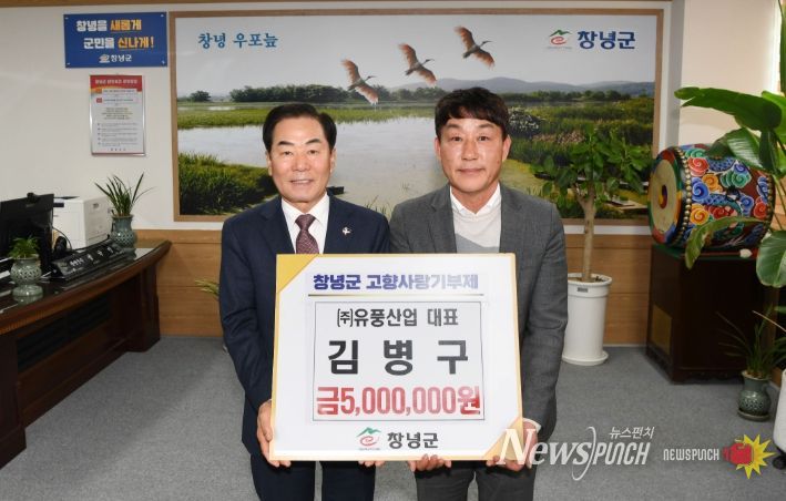 뉴스펀치 김길룡 기자 | 창녕군은 지난 25일 (주)유풍산업 김병구 대표가 고향사랑기부금 500만 원을 기탁했다고 밝혔다.