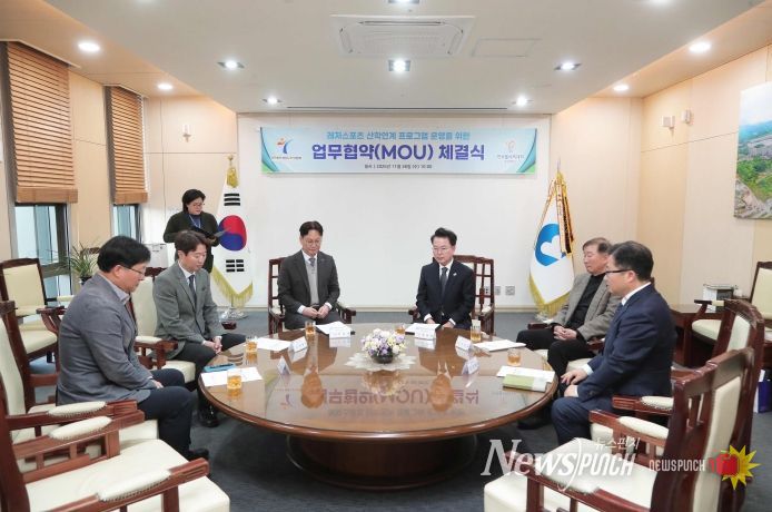 뉴스펀치 김길룡 기자 | (재)춘천레저‧태권도조직위원회(위원장 육동한)가 26일 시청 접견실에서 한국폴리텍대학 춘천캠퍼스(학장 지경배)와 레저스포츠 산학연계 프로그램 운영을 위한 업무협약을 체결했다.