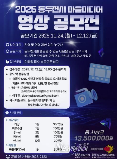 뉴스펀치 김길룡 기자 | 동두천시는 지역 곳곳의 숨은 매력을 발굴하고 시민 참여형 홍보콘텐츠를 확대하기 위해 ‘2025년 동두천시 마을미디어 영상 공모전’을 개최한다.