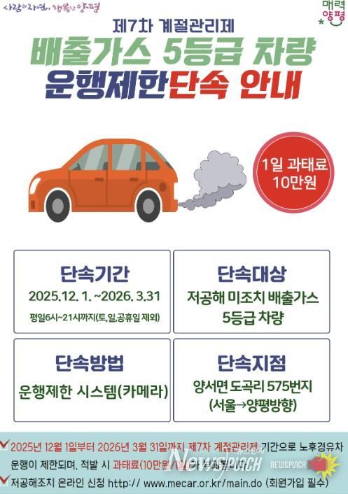 뉴스펀치 김길룡 기자 | 양평군(은 오는 12월 1일부터 2026년 3월 31일까지 제7차 미세먼지 계절 관리제 시행에 따라 배출가스 5등급 차량에 대한 운행 제한 단속을 시행한다고 밝혔다.