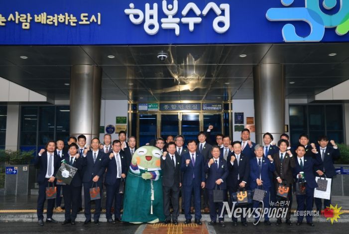 뉴스펀치 조평훈 기자 | 대구 수성구는 지난 25일 일본 오사카부 이즈미사노시의 마세 미치히로 부시장과 킨노 야스유키 상공회의소 회장을 비롯한 경제인 대표단 30명이 수성구청을 방문했다고 밝혔다.