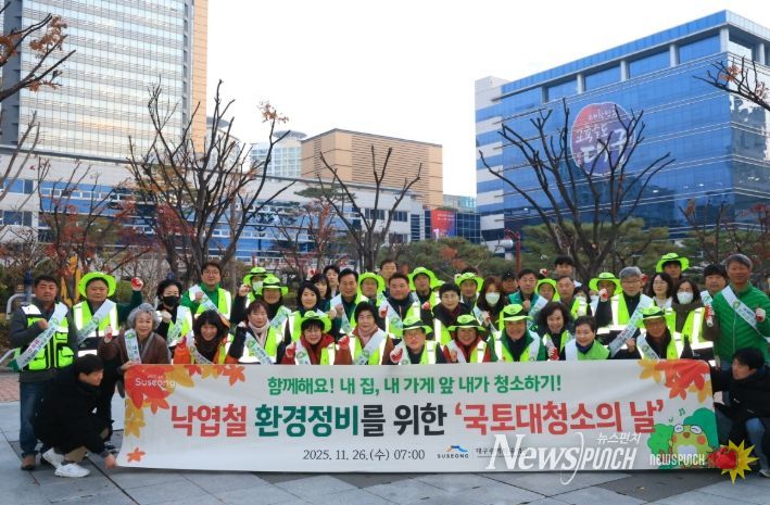 뉴스펀치 조평훈 기자 | 대구 수성구는 26일 대구광역시 교육청 인근에서 겨울철 낙엽 정비를 위한 ‘국토대청소의 날’ 행사를 개최했다.