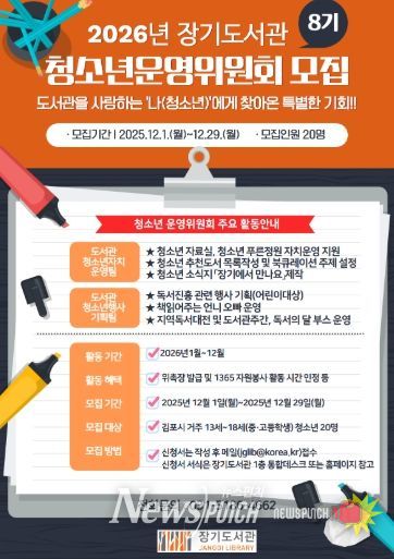 뉴스펀치 김길룡 기자 | 김포시 장기도서관은 2026년 제8기 청소년운영위원회 위원으로 활동할 김포시 거주 13세~18세 청소년 20명을 오는 12월 1일부터 모집한다.