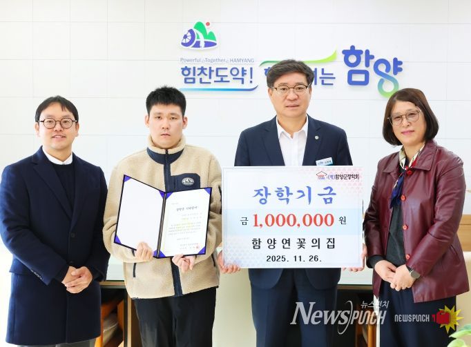 뉴스펀치 김길룡 기자 | (재)함양군장학회는 11월 26일 함양연꽃의 집(원장 김재성)에서 인재 양성을 위해 장학금 100만 원을 기탁했다고 밝혔다.