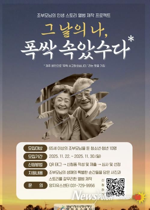 뉴스펀치 김길룡 기자 | 성남시청소년청년재단 양지유스센터에서 지역 어르신의 삶을 기록하고 세대 간 공감을 확산하기 위한 생애앨범 제작 프로젝트 '그 날의 나, 폭싹 속았수다'를 진행한다.