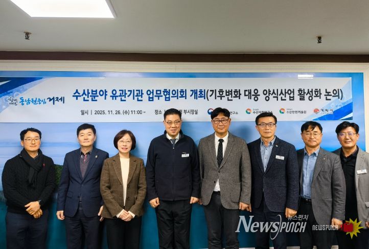 뉴스펀치 김길룡 기자 | 거제시는 기후변화 대응과 지속가능한 양식산업 발전을 위한 정보 공유 및 협력 강화를 위해 11월 26일 거제시청 부시장실에서 국립수산과학원 남동해수산연구소, 경남도수산자원연구소, 경남수산안전기술원과 업무협의회를 개최했다고 밝혔다.