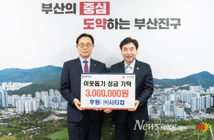 뉴스펀치 김길룡 기자 | (주)시티캅(대표이사 정현돈)은 11월 25일 부산진구(구청장 김영욱)를 방문해 이웃돕기 성금 300만 원을 전달했다.