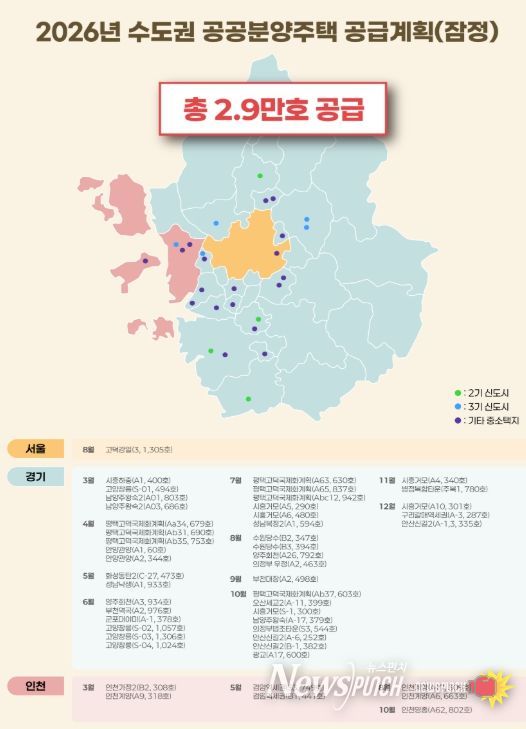 뉴스펀치 조평훈 기자 | 국토교통부와 4개 공공기관은 ’26년 수도권 공공택지에서 총 2.9만호 규모의 공공분양주택을 순차적으로 공급할 계획이라고 밝혔다.