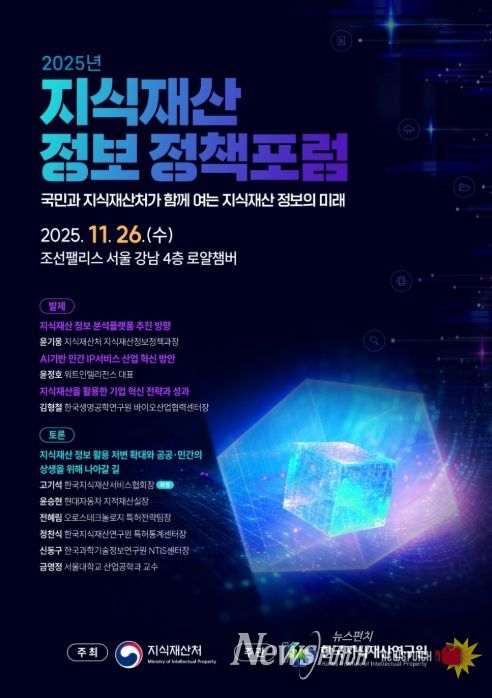 뉴스펀치 조평훈 기자 | 지식재산처는 11월 26일 13시, 조선팰리스 서울 강남(서울 강남구)에서 ‘2025년 지식재산 정보 정책 공개 토론회’을 개최한다고 밝혔다.