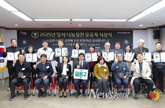 뉴스펀치 조평훈 기자 | 대구 달서구는 지난 26일 달서구청에서 지역의 어려운 이웃을 위해 꾸준한 나눔을 실천해 온 기업·단체 및 개인 유공자들에게 감사의 뜻을 전하는 ‘2025년 나눔실천 유공자 시상식’을 개최했다.