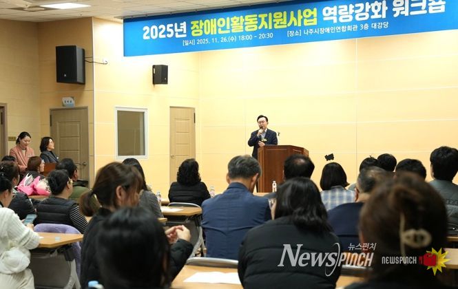 뉴스펀치 김윤걸 기자 | 전라남도 나주시는 지난 26일 장애인활동지원사업 관계자와 활동지원사 100여 명을 대상으로 ‘장애인활동지원사업 역량 강화 워크숍’을 개최했다고 밝혔다.