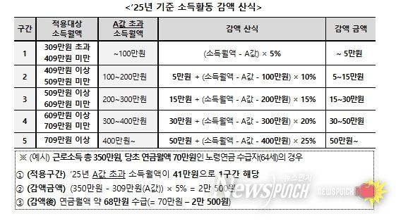 기존에는 국민연금 전체 가입자의 평균소득(이하 A값)보다 많은 근로·사업소득이 있는 경우, A값을 초과하는 월 소득을 100만 원 단위의 5개 구간으로 나누어 5~25%에 해당하는 금액을 연금액에서 감액했다. 초과소득월액이 100만 원 미만이면 최대 5만 원, 200만 원 미만이면 최대 15만 원이 연금액에서 깎이는 구조였다.