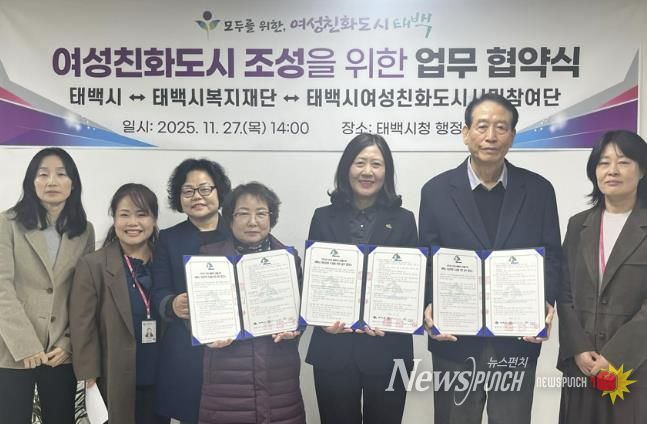 뉴스펀치 김길룡 기자 | 태백시는 지난 27일 태백시복지재단과 태백시여성친화도시 시민참여단과 함께 여성친화도시 조성을 위한 업무협약을 체결하고, 여성과 사회적 약자를 위한 안전하고 평등한 도시 환경 조성에 본격적으로 나섰다고 밝혔다.