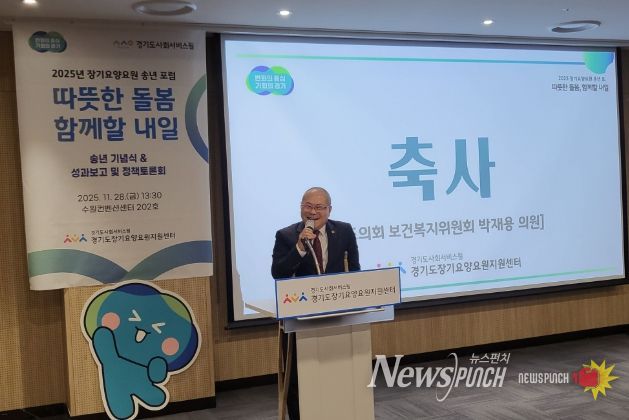 뉴스펀치 김길룡 기자 | 경기도의회 보건복지위원회 박재용 의원(더불어민주당, 비례)은 28일, 수원컨벤션센터에서 열린 ‘2025 장기요양요원 송년 포럼’에 참석해 장기요양요원의 처우개선과 지속가능한 돌봄 환경 조성을 위한 의회의 역할을 강조했다. 이번 포럼에는 경기도의회 보건복지위원회 김동규 의원(더불어민주당, 안산1)도 함께해 현장의 의견을 경청하고 장기요양 종사자들을 격려했다.