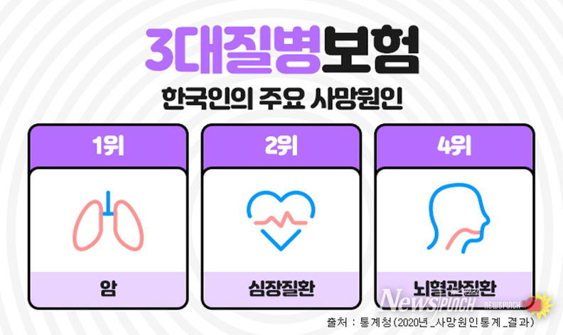 뉴스펀치 조은별 기자 | 한국인의 주요 사망원인중에 암, 뇌혈관질환, 심혈관질환은 흔히 3대질병이라 일컬어지며 살아가면서 가장 먼저 대비해야 하는 중대질병으로 항상 강조되고 있다. 이들 질병에 미리 대비하기 위해 가입하는 것이 진단비보험인데, 이러한 3대질병진단비를 중점으로 보장하는 보장성보험이 3대진단비보험 이다. 3대질병진단비보험은 각각의 질병에 주목해서 보장하기도 하지만, 나에게 맞는 추가 특약을 잘 골라서 가입한다면 종합건강보험으로도 충분히 활용도가 높다.