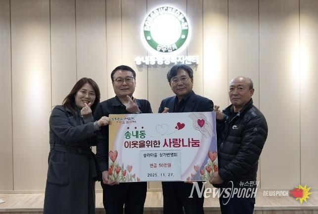 뉴스펀치 김길룡 기자 | 동두천시 송내동 송라마을 상가번영회는 지난 27일 지역 내 어려운 이웃을 지원하기 위해 성금 50만 원을 송내동 행정복지센터에 전달했다.