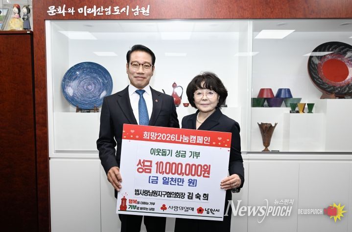뉴스펀치 정홍균 기자 | 남원시는 '희망2026 나눔 캠페인'의 본격적인 시작과 함께, 매년 꾸준한 나눔을 실천해 온 김숙희 회장(법무부 법사랑위원 남원지구협의회)이 올해도 변함없는 기부 참여로 남원시 1호 기부자가 됐다고 밝혔다.