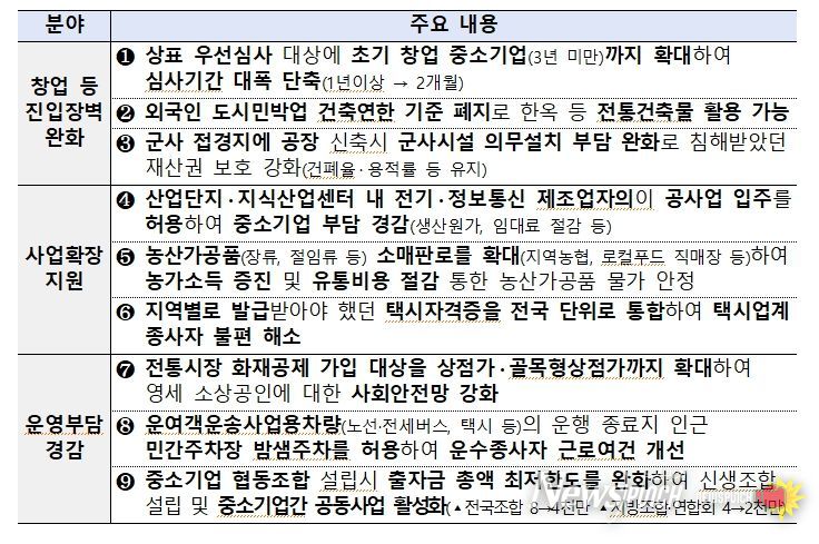 이번 방안은 경기 회복의 흐름이 민생현장의 지속가능한 성장과 도약으로 이어지도록, 중소기업과 소상공인이 사업운영 전반에서 체감하는 불합리한 규제애로를 선제적으로 개선하기 위해 마련됐다.
