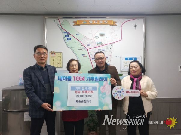 뉴스펀치 김길룡 기자 | 밀양시 내이동 세종종합PVC(대표 정병욱)은 지난 7월 ‘100+4 기부릴레이 시즌2’의 첫 주자로 참여한 데 이어 2일 내이동 자원봉사회(회장 서정구)에 200만 원을 추가로 기탁했다.