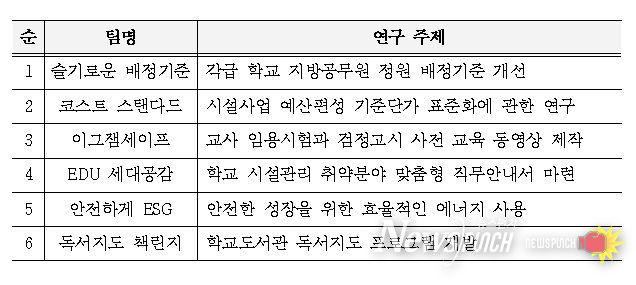 우수행정연구회로는 △각급 학교 지방공무원 정원 배정기준 개선(슬기로운 배정기준) △시설사업 예산편성 기준단가 표준화에 관한 연구(코스트 스탠다드) △교사 임용시험과 검정고시 사전 교육 동영상 제작(이그잼세이프) △학교 시설관리 취약분야 맞춤형 직무안내서 마련(EDU 세대공감) △안전한 성장을 위한 효율적인 에너지 사용(안전하게 ESG) △학교도서관 독서지도 프로그램 개발(독서지도 책린지) 등 6팀이 선정됐다.