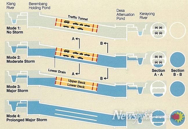 말레이시아 정부는 비가 오면 수시로 넘쳤던 클랑강 범람을 막고 평상시에는 쿠알라룸푸르 시내 교통 정체를 해소하기 위해 2007년 복합터널 ‘SMART’를 건설했다. 일정 강우량 이상 비가 내리면 차량 통행을 통제하고 하천 유량을 조절하는 통로로 사용한다.