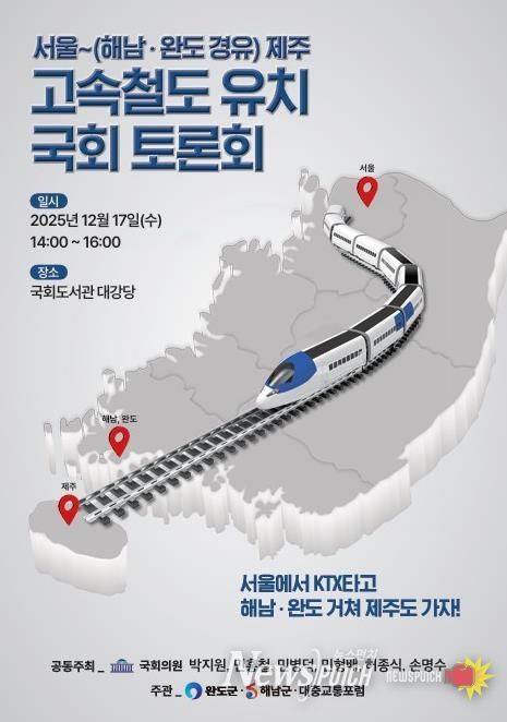 뉴스펀치 김길룡 기자 | 전남 완도군이 ‘서울~해남·완도 경유 제주 고속철도 사업’을 '제5차 국가 철도망 구축 계획'에 반영하기 위해 12월 17일 오후 2시 국회도서관 대강당에서 토론회를 개최한다.