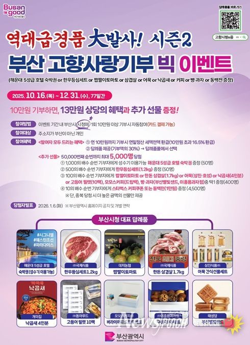 한편, 고향사랑기부금은 부산지역 취약계층 지원, 청소년 육성, 문화·예술·보건 증진 등 다양한 공익사업에 활용되며, 기부는 온라인 포털 '고향사랑 이(e)음'을 통해 간편하게 참여할 수 있다.