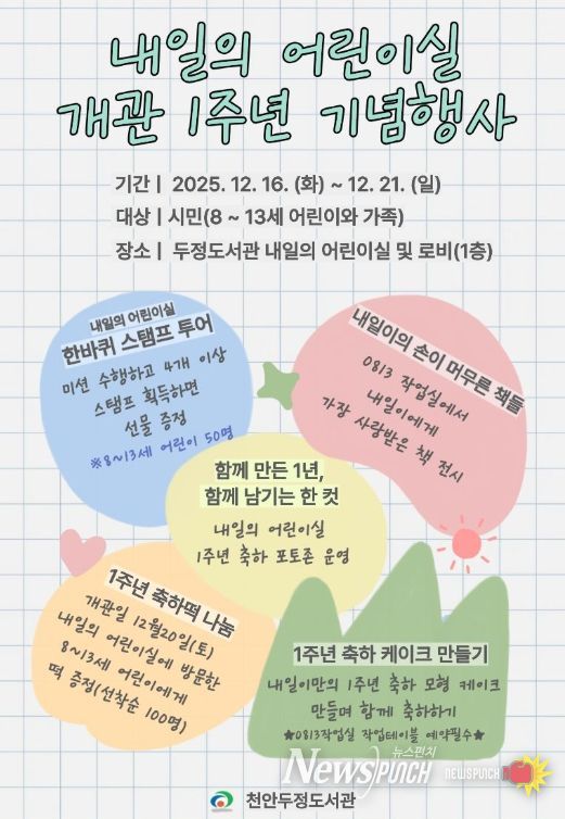 뉴스펀치 김길룡 기자 | 천안시 두정도서관은 오는 16~ 21일 ‘내일의 어린이실’ 개관 1주년 맞아 다채로운 기념행사를 운영한다고 15일 밝혔다.