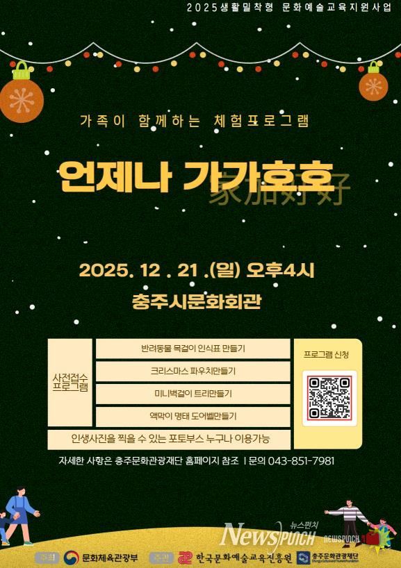 뉴스펀치 김길룡 기자 | 충주문화관광재단이 가족대상 연말 문화예술 교육프로그램 ‘언제나 가가호호(家加好好)’를 오는 12월 21일 오후 4시부터 충주시문화회관에서 개최한다.
