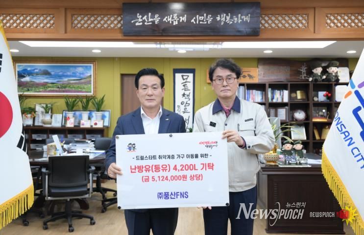논산시는 15일 국방산업 전문기업 ㈜풍산FNS가 저소득 아동들을 위해 약 500만 원 상당의 등유 4,200리터를 기탁했다고 밝혔다.