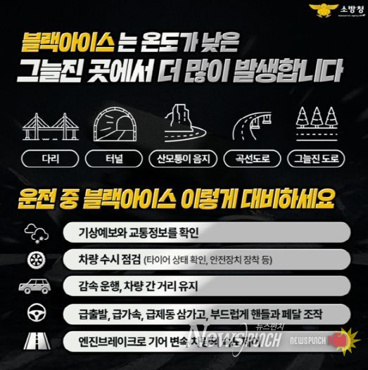 뉴스펀치 김길룡 기자 | 홍성소방서(서장 강기원)는 겨울철 기온 급강하로 인해 도로 위 블랙아이스 발생이 잦아짐에 따라 교통사고 및 보행자 안전사고에 각별한 주의를 당부했다. 블랙아이스는 도로 표면에 얇고 투명하게 얼어붙은 얼음층으로, 눈이나 얼음이 육안으로 잘 보이지 않아 운전자와 보행자가 인지하기 어려운 것이 특징이다. 특히 새벽과 야간 시간대, 터널 출입구, 교량 위, 그늘진 도로 구간에서는 갑작스러운 차량 미끄러짐 사고가 발생할 가능성이 높다.