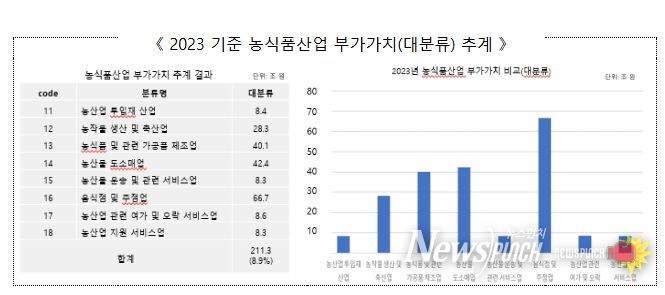 그간 농업 부가가치는 주로 쌀·채소·과일·축산업 등 1차 생산물 중심으로 집계되어 전 산업의 1% 수준에 불과한 것으로 알려져 왔으나, 연구 결과에 따르면 투입재를 비롯한 농산물의 가공·포장·유통 등 연관 산업과 스마트농업, 반려동물산업 등 신산업을 포함하면 그 비중이 ’23년 기준으로 전체 산업의 8.9% 수준, 부가가치 규모도 211조 원에 달하는 것으로 나타났다.
