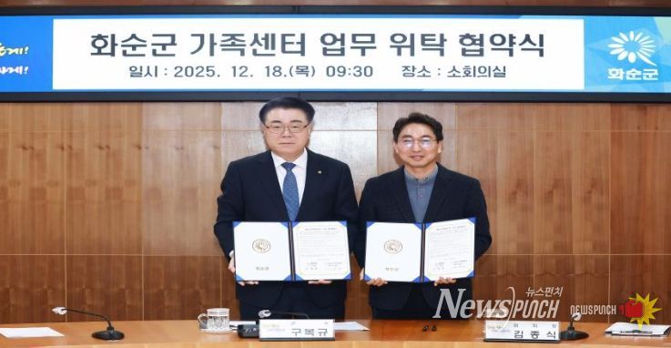 뉴스펀치 김길룡 기자 | 화순군은 18일 화순군청 소회의실에서 (사)다사랑건강가정복지협회(회장 김종식)와 화순군 가족센터 업무 위탁 협약을 체결하고, 가족 지원 정책의 안정적 추진과 지역사회 돌봄 기반 확충에 나섰다고 밝혔다.