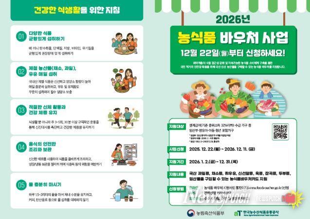 뉴스펀치 김길룡 기자 | 농림축산식품부는 2026년 농식품 바우처 사업 신청이 2025년 12월 22일부터 시작된다고 밝혔다.