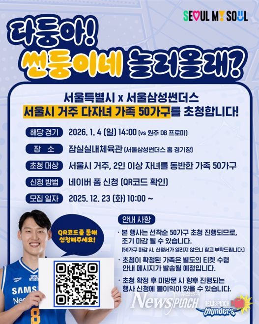 뉴스펀치 김완규 기자 | 서울시가 2026년 새해를 맞아 1월 4일 오후 2시 잠실실내체육관(송파구 올림픽로 25)에서 열리는 서울시 연고 구단 ‘서울삼성썬더스농구단’의 홈경기에 다자녀 50가족을 무료 초청한다.