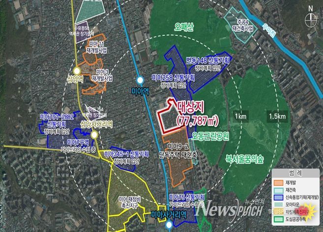 이번 신속통합기획은 과거 주택단지 중심 개발로 시가지와 단절됐던 오패산 녹지축을 미아역(도봉로) 일대까지 확장하고, 입체공원 도입과 사업성 보정계수(1.8) 적용을 통해 총 1,730세대, 최고 35층 규모의 쾌적하고 안전한 주거단지를 조성하는 것이 핵심이다.
