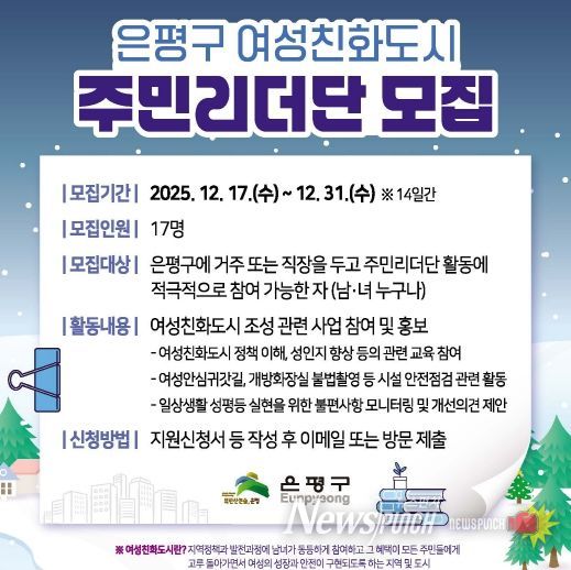 뉴스펀치 김완규 기자 | 서울 은평구는 여성친화도시 조성을 위해 함께 할 ‘여성친화도시 주민리더단’ 단원을 새로 모집한다고 밝혔다.