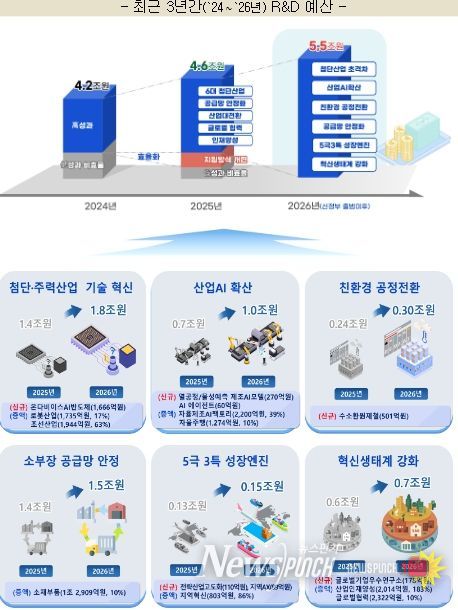 산업부는 ’25년대비 18% 증액된 역대 최대규모인 총 5.5조원을 지원하며, 신규 지원과제는 ’25년대비 85% 증가한 1.4조원을 투자한다. 지원 분야별로는 ▲반도체·이차전지·바이오·미래차·로봇·조선 등 첨단·주력산업 기술혁신에 1조 8,325억원(증액28%), ▲AI팩토리, 피지컬AI 등 산업 AI 확산 기술(M.AX)에 1조 455억원(증액52%), ▲수소환원제철 등 친환경 공정전환 기술에 2,990억원(증액24%), ▲경제안보를 위한 소부장 공급망 안정화에 1조 4,914억원(증액7%), ▲지역전략산업 육성 등 5극3특 성장엔진에 1,528억원(증액14%), ▲우수인재양성, 글로벌 협력 등 혁신생태계 강화에 7,040억원(증액16%)을 지원한다.